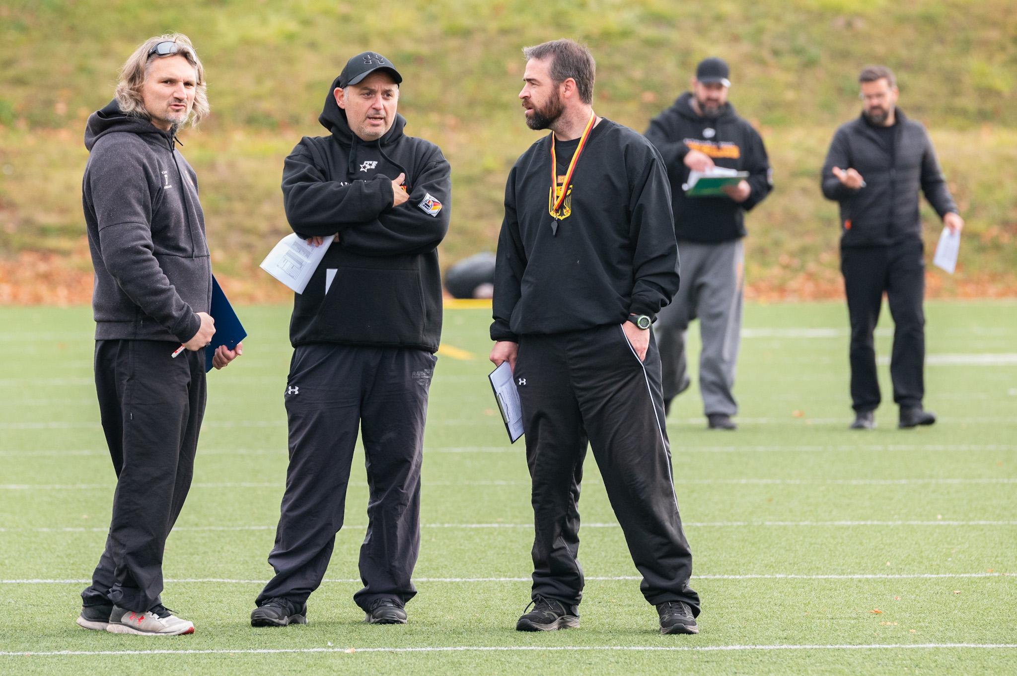 Teamchef Jordan Neuman (mit Bundesadler) diskutiert mit Coaches (Foto Manfred Löffler) Teamchef Jordan Neuman (mit Bundesadler) bei der Analyse (Foto: Manfred Löffler)